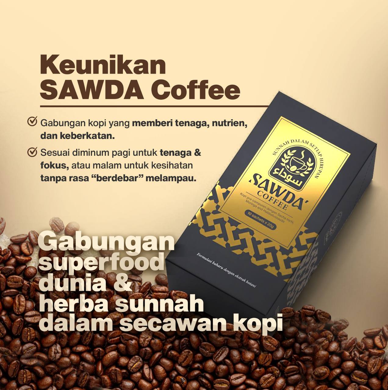 Kopi SAWDA adalah minuman kopi yang diperkaya dengan ekstrak moringa, sacha inchi dan habbatussauda yang terkenal dengan pelbagai manfaat kesihatan. Ia membantu meningkatkan tenaga dan menyokong sistem imun badan.